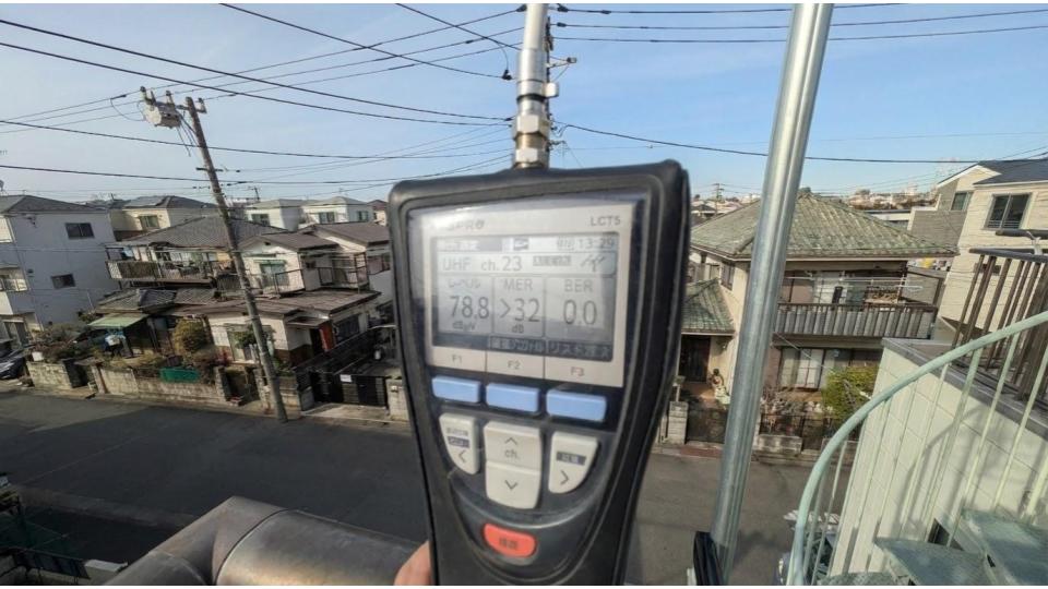 TV受信信号をテスターで確認しました。川崎区なので、かなり良好の受信感度でした。これで受信不足でのブロックノイズや映らなくなることはないと思われます。